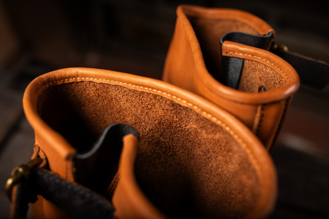 Скошенный каблук из резины — чтобы не летели капли и грязь при ходьбе, каблук также посажен на гвозди для надежности, регулятор верхнего ремня вместо пряжки (для лаконичности), анатомическая пятка и «посаженное» голенище, хоть и могут в первые разы усложнять вход в модель (рекомендуем использовать ложку, а на ногу надеть пакет), в последствии обеспечивают хорошую фиксацию без «болтанки» и сдирания носков. Ремень на подъеме дополнительно усилен тесьмой и подкладкой, чтобы не растягивался. Таким образом, сапог можно нормально зафиксировать на ноге.