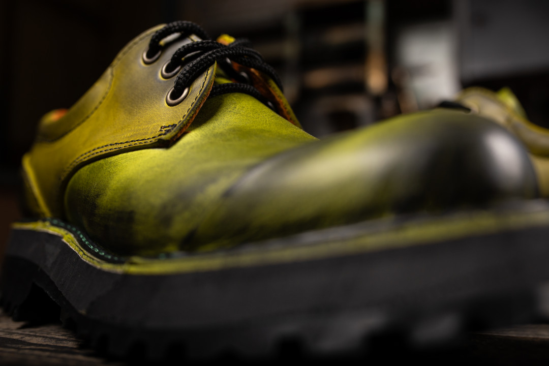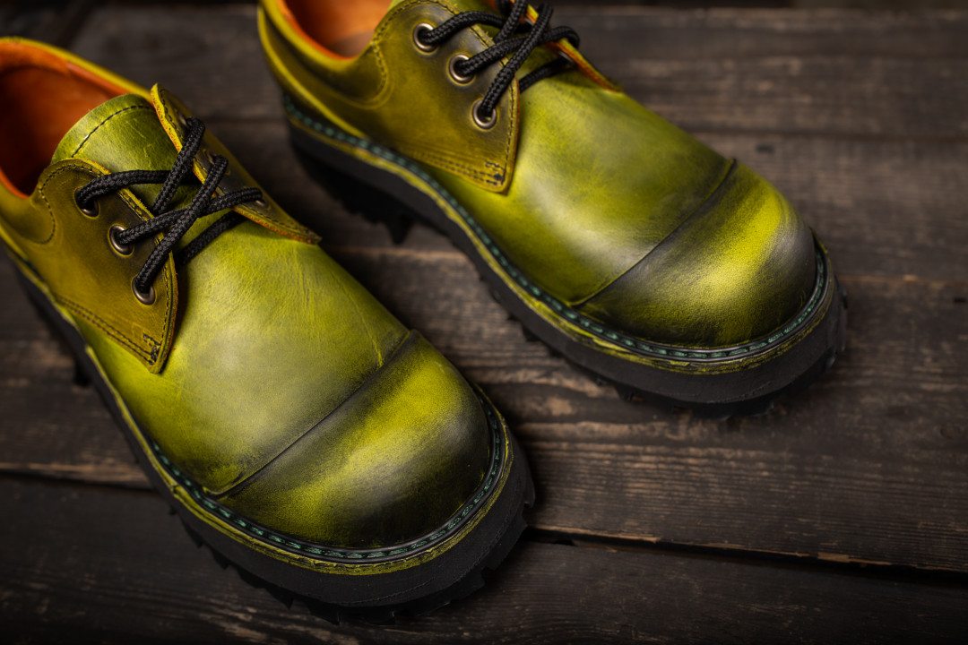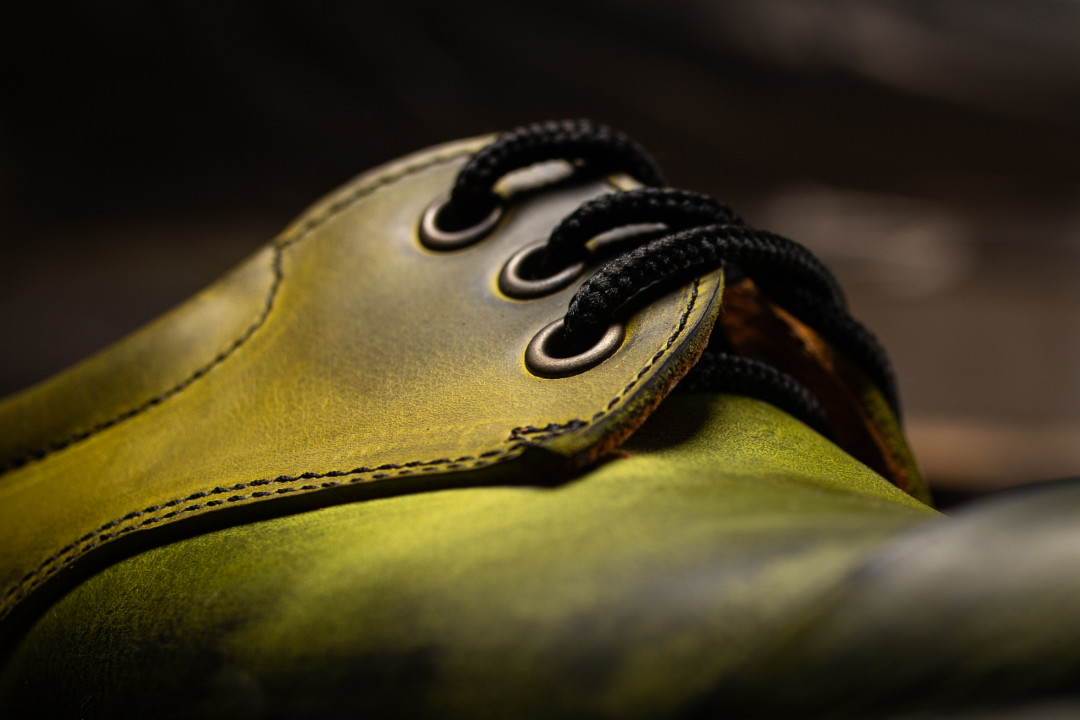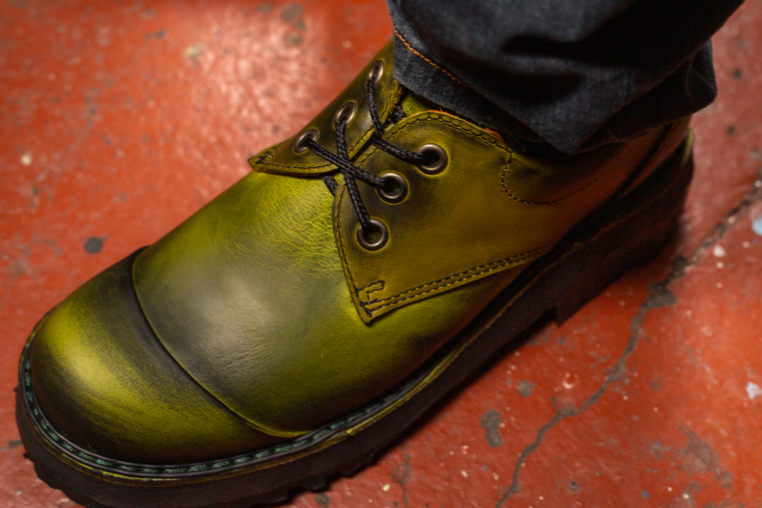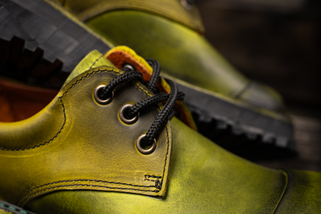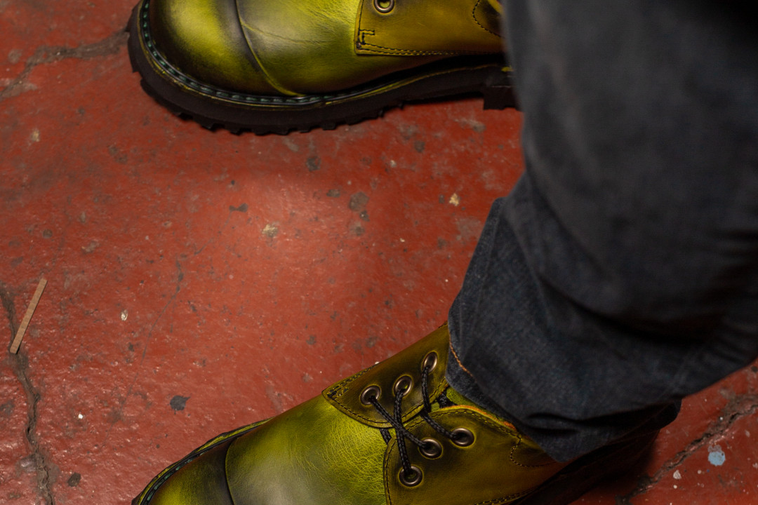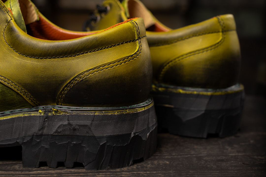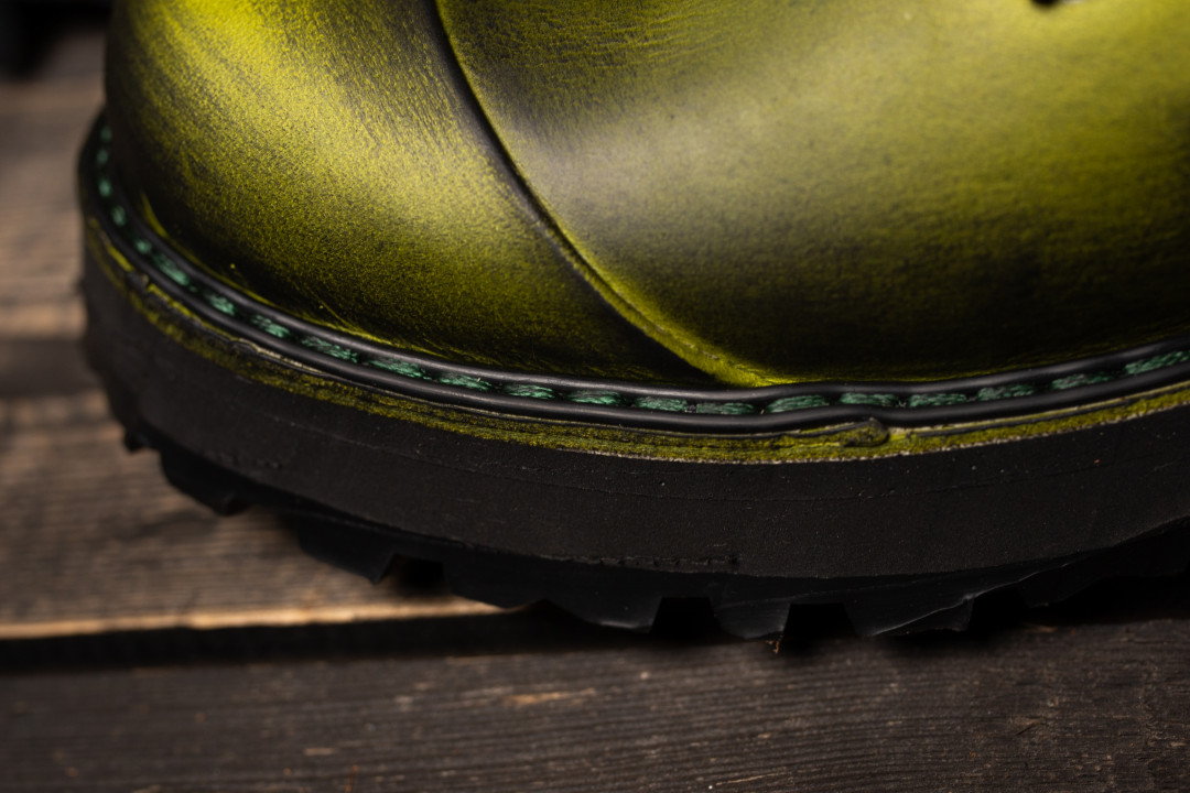 Джек сделан из довольно редкой кожи — вощеный крейзи хорс (номер в каталоге 257). Не слишком яркий и в то же время выделяющийся в толпе болотно-кислотный цвет, приглушенный тонировкой черным воском. При старении будет красиво царапаться и слегка светлеть на сгибах. Обработанный жиром сильно потемнеет. Обработанный кремом Gardenia или Seta из нашего арсенала — не изменит вид, сослужит хорошую службу (особенно если периодически этот самый крем наносить).