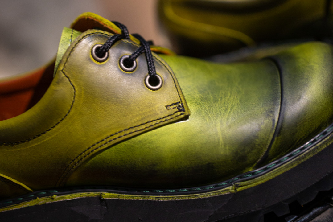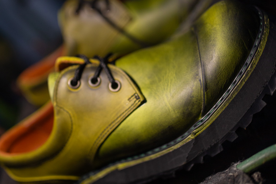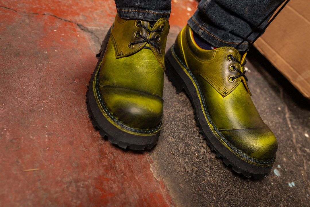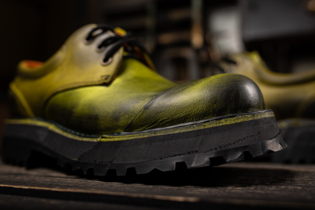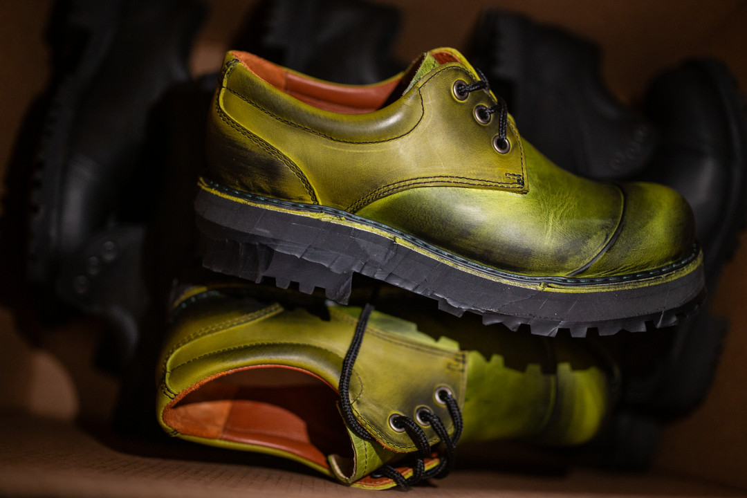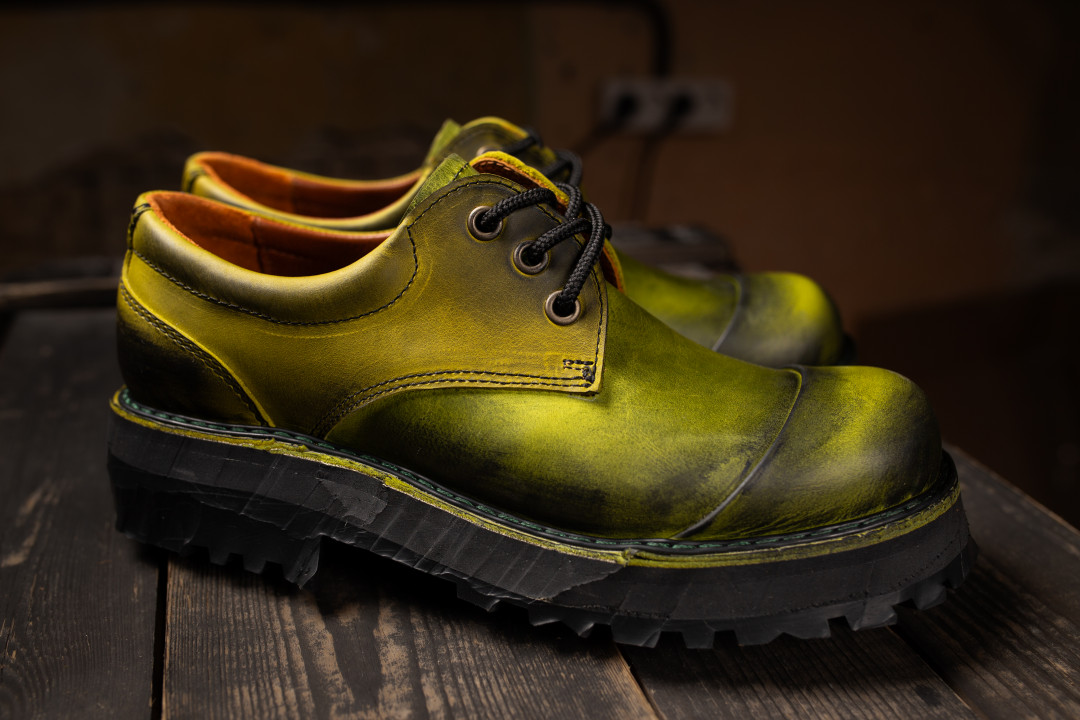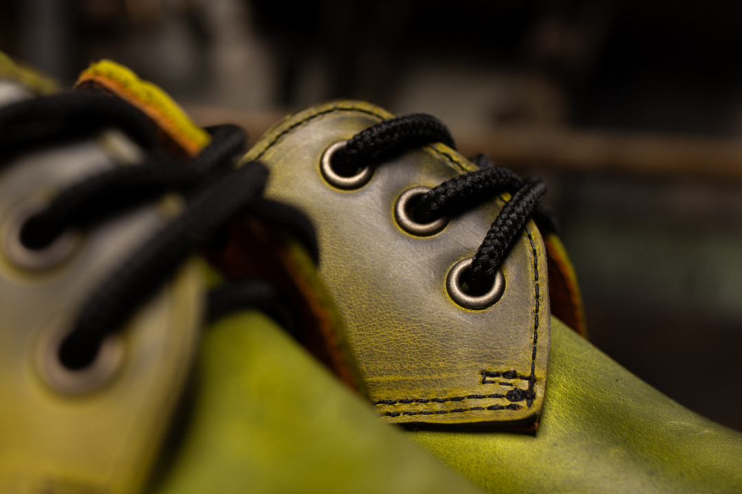 Джек сделан из довольно редкой кожи — вощеный крейзи хорс (номер в каталоге 257). Не слишком яркий и в то же время выделяющийся в толпе болотно-кислотный цвет, приглушенный тонировкой черным воском. При старении будет красиво царапаться и слегка светлеть на сгибах. Обработанный жиром сильно потемнеет. Обработанный кремом Gardenia или Seta из нашего арсенала — не изменит вид, сослужит хорошую службу (особенно если периодически этот самый крем наносить).