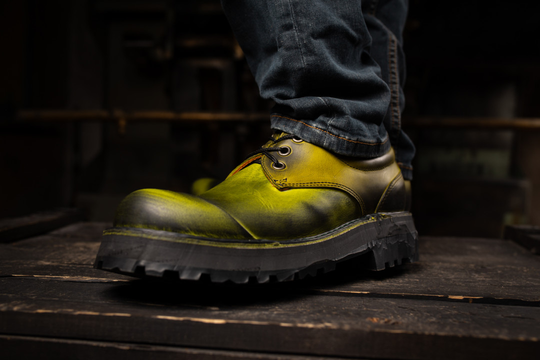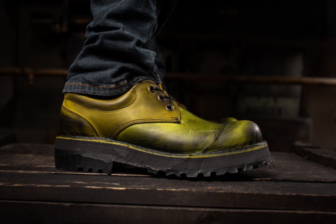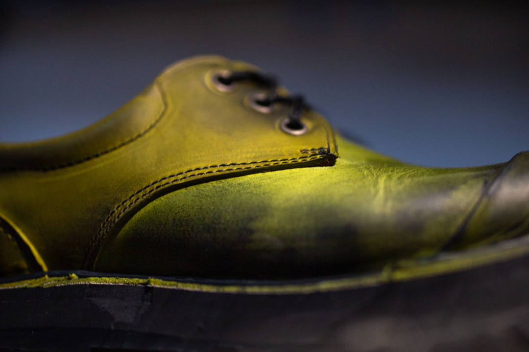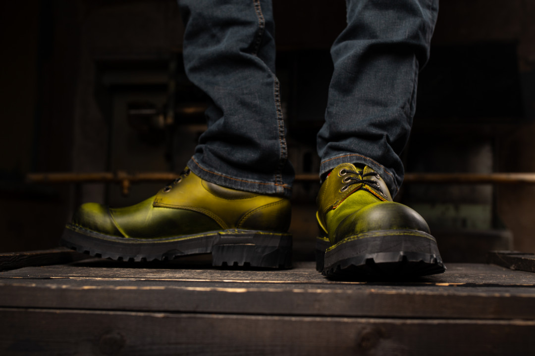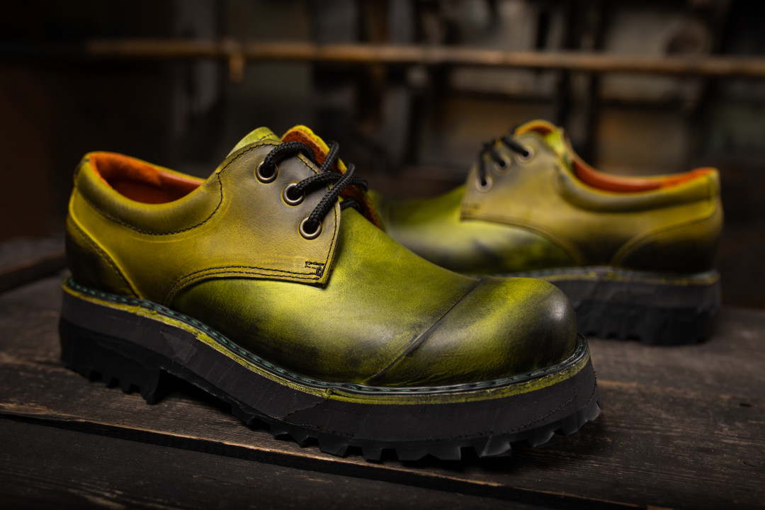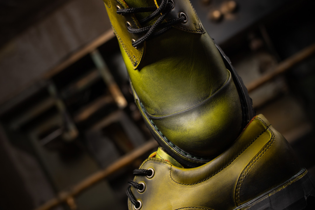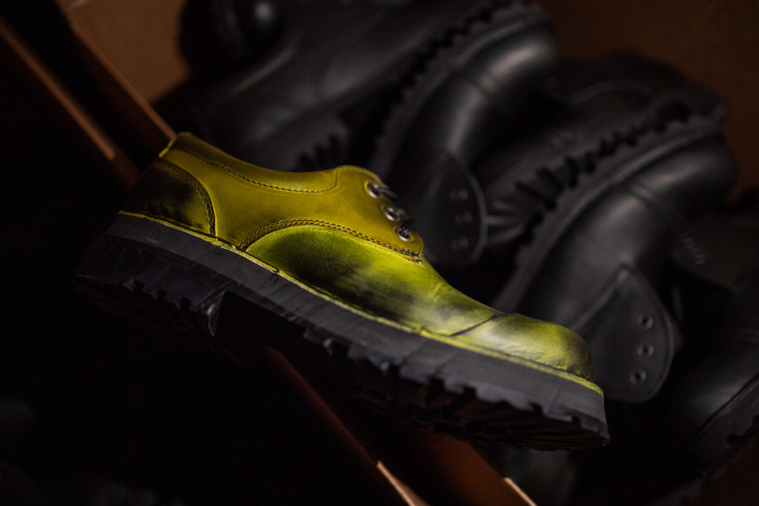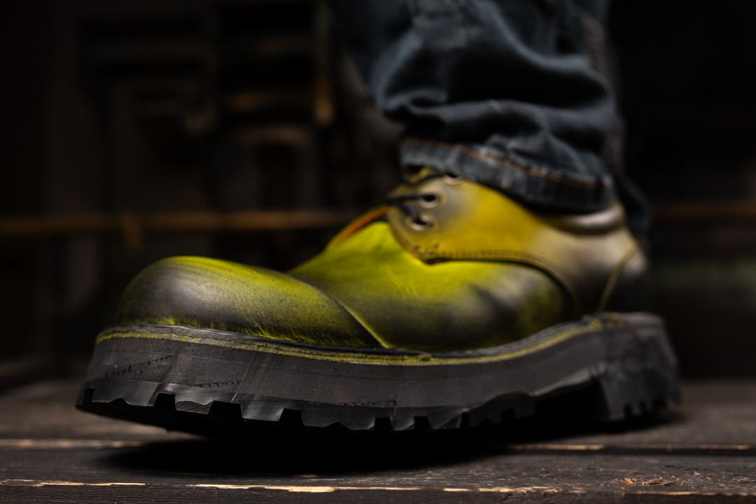Джек сделан из довольно редкой кожи — вощеный крейзи хорс (номер в каталоге 257). Не слишком яркий и в то же время выделяющийся в толпе болотно-кислотный цвет, приглушенный тонировкой черным воском. При старении будет красиво царапаться и слегка светлеть на сгибах. Обработанный жиром сильно потемнеет. Обработанный кремом Gardenia или Seta из нашего арсенала — не изменит вид, сослужит хорошую службу (особенно если периодически этот самый крем наносить).