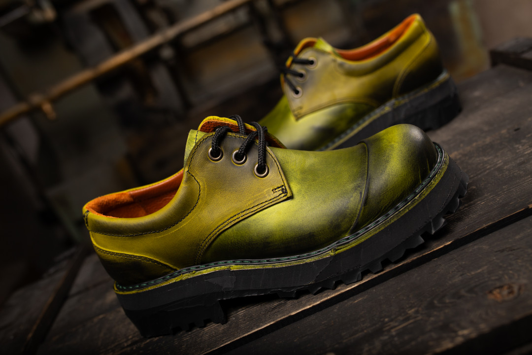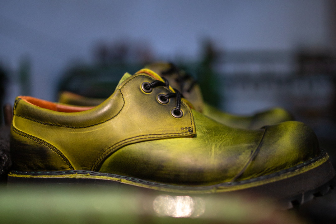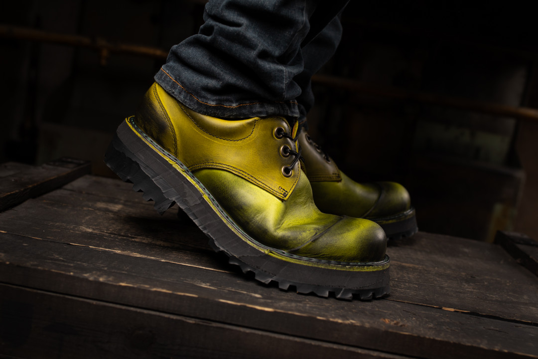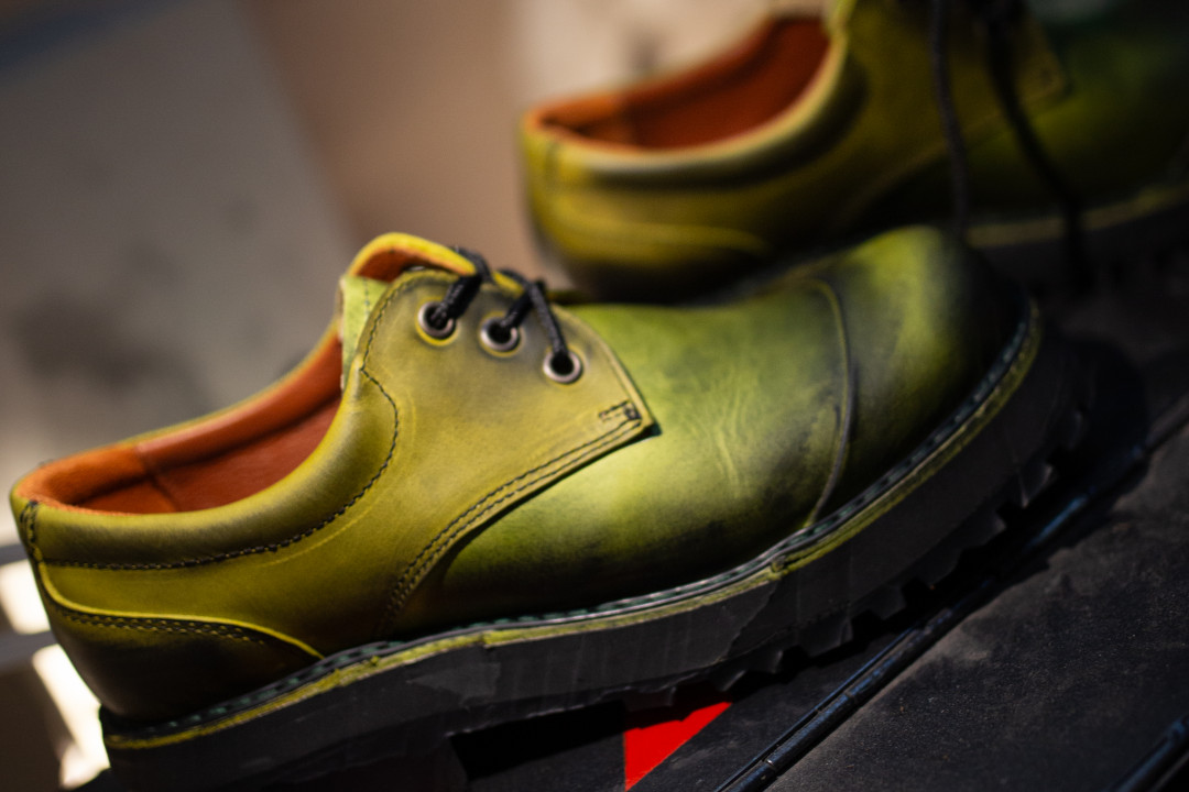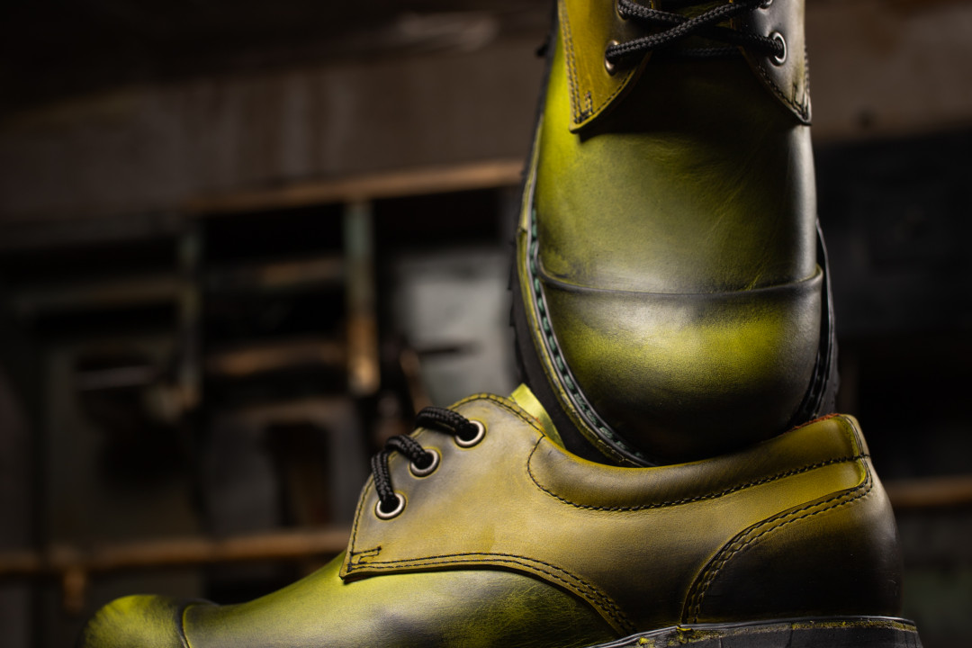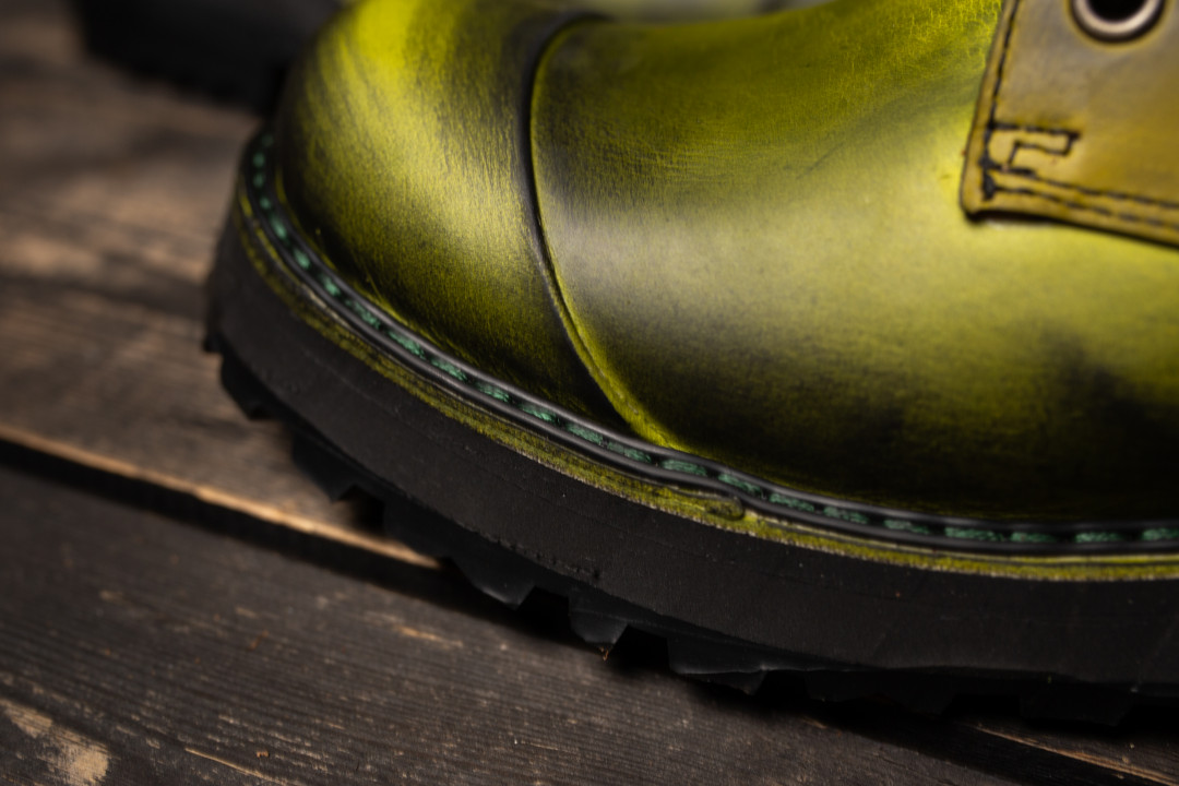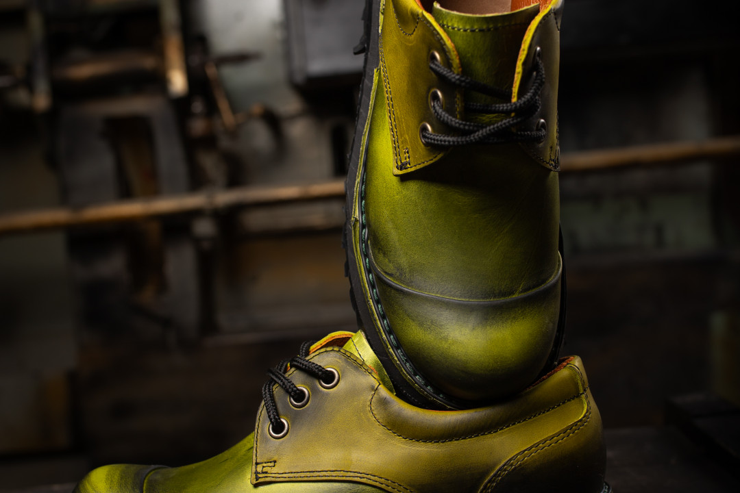 Джек сделан из довольно редкой кожи — вощеный крейзи хорс (номер в каталоге 257). Не слишком яркий и в то же время выделяющийся в толпе болотно-кислотный цвет, приглушенный тонировкой черным воском. При старении будет красиво царапаться и слегка светлеть на сгибах. Обработанный жиром сильно потемнеет. Обработанный кремом Gardenia или Seta из нашего арсенала — не изменит вид, сослужит хорошую службу (особенно если периодически этот самый крем наносить).