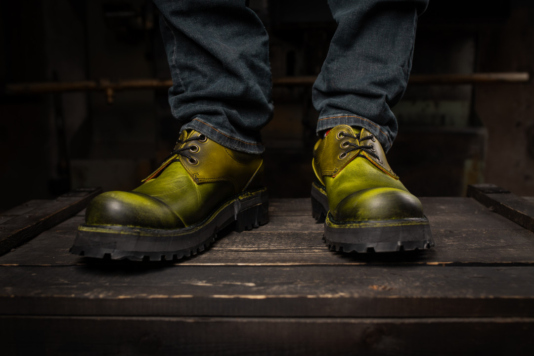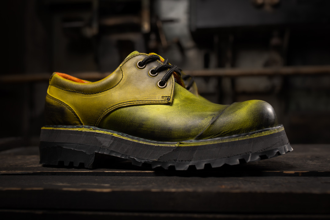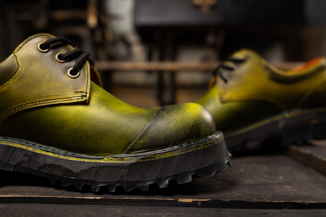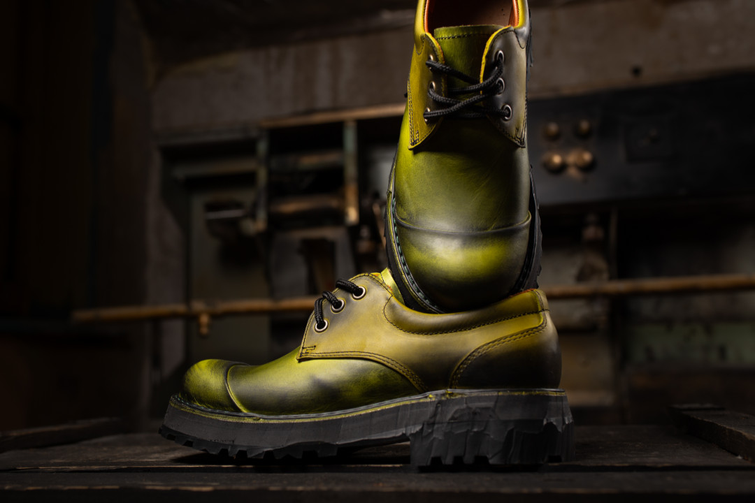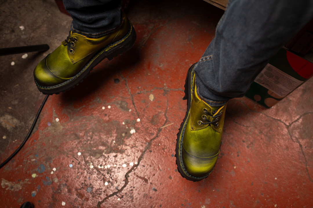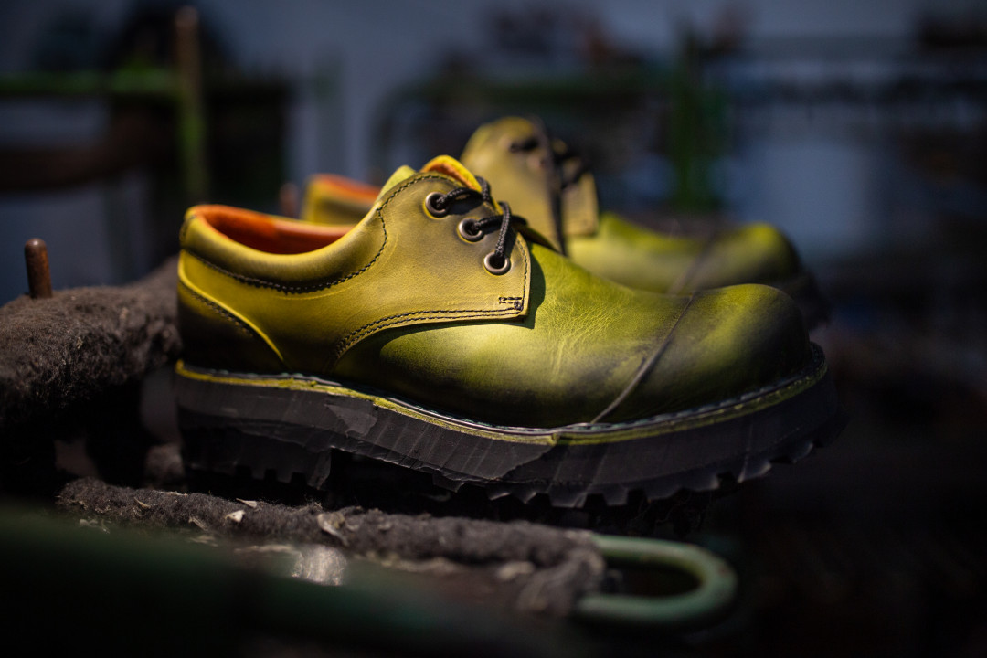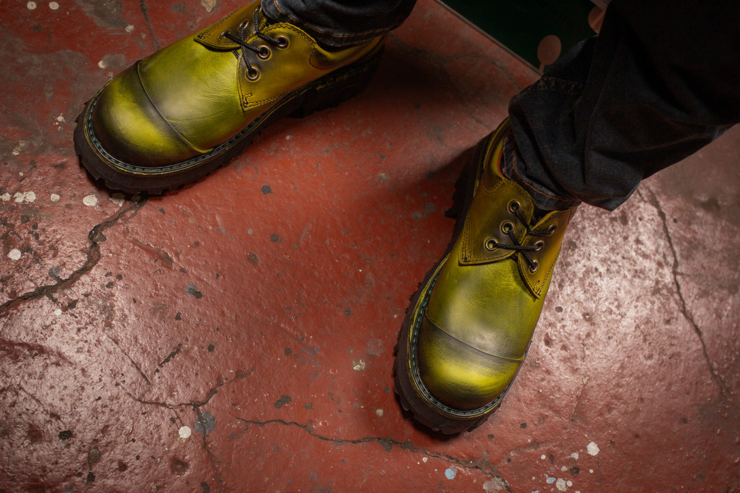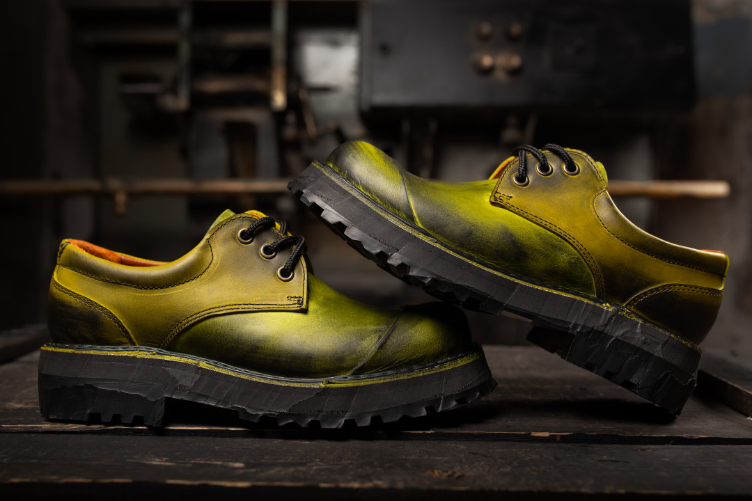 Джек сделан из довольно редкой кожи — вощеный крейзи хорс (номер в каталоге 257). Не слишком яркий и в то же время выделяющийся в толпе болотно-кислотный цвет, приглушенный тонировкой черным воском. При старении будет красиво царапаться и слегка светлеть на сгибах. Обработанный жиром сильно потемнеет. Обработанный кремом Gardenia или Seta из нашего арсенала — не изменит вид, сослужит хорошую службу (особенно если периодически этот самый крем наносить).