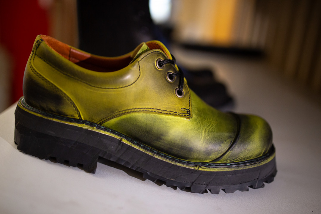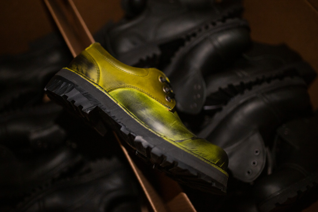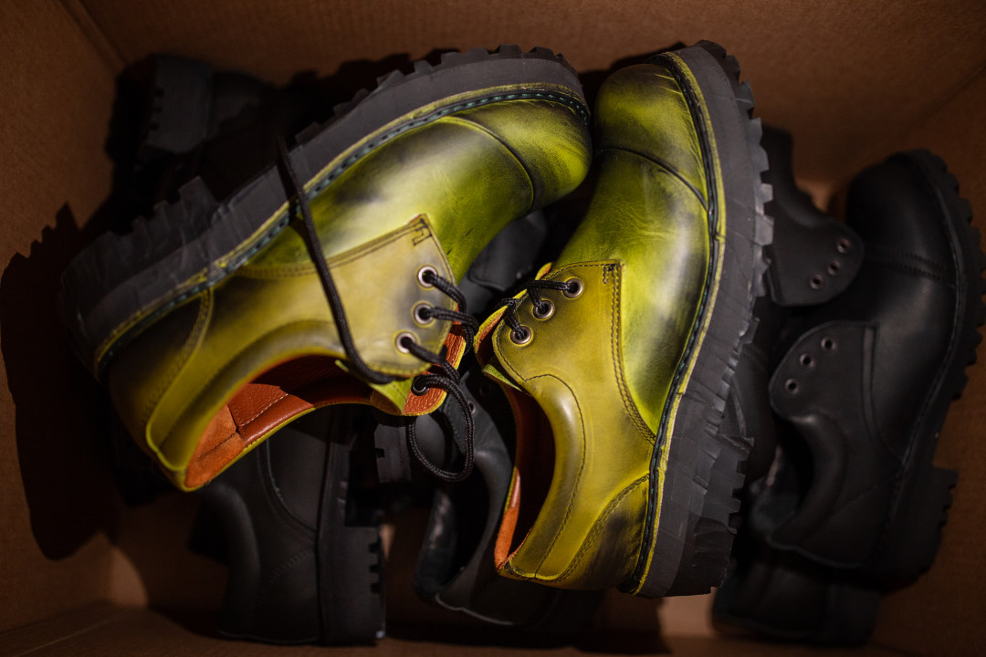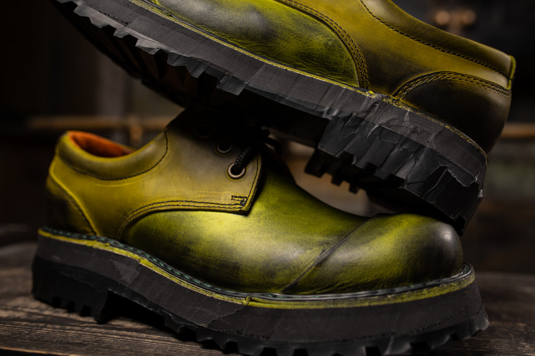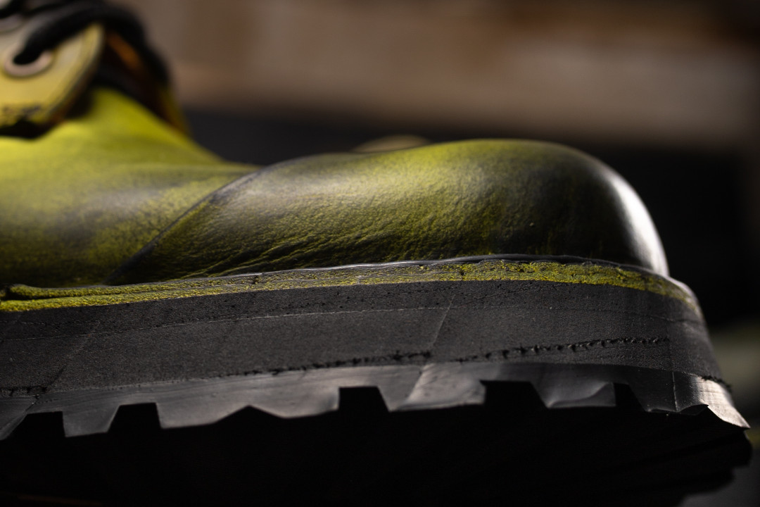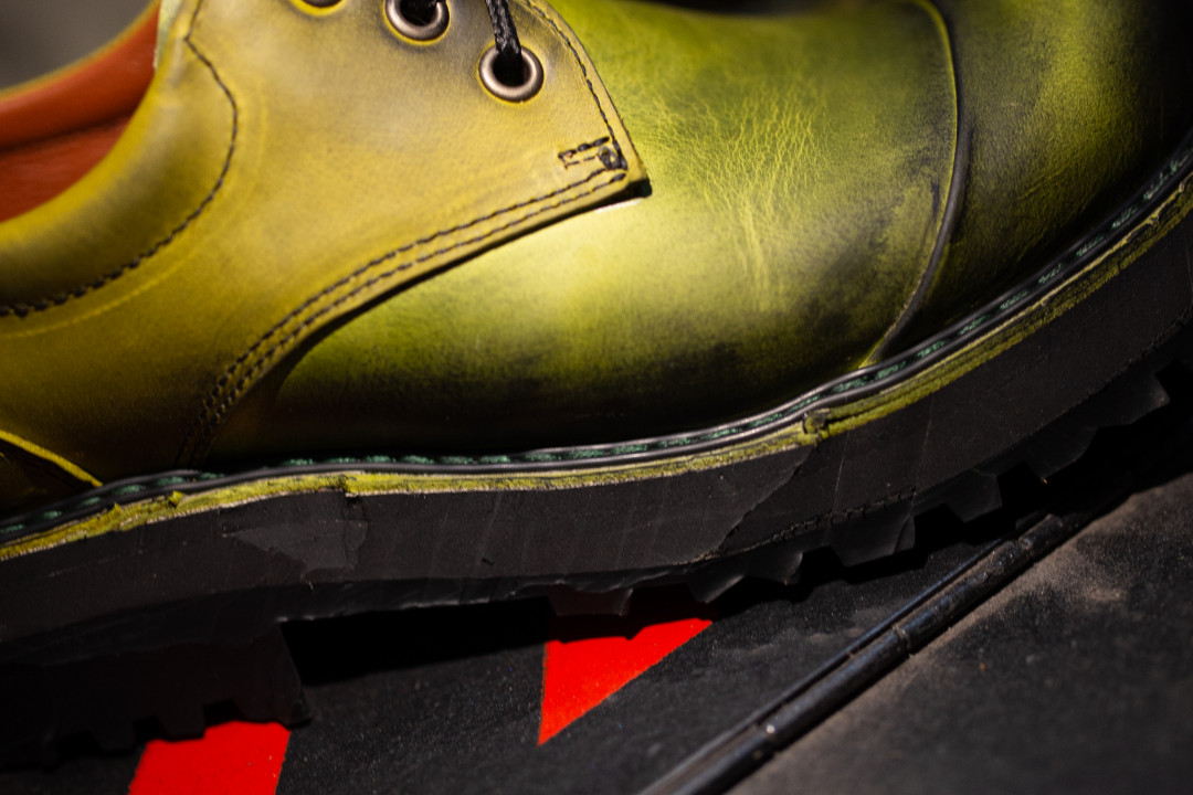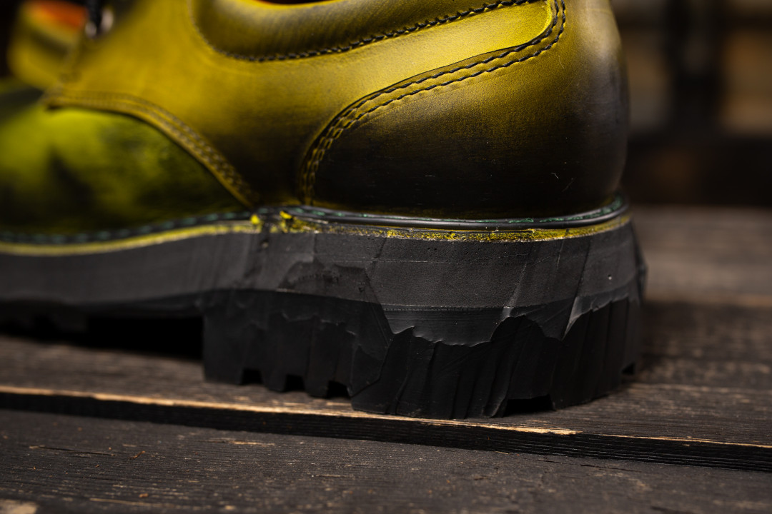 Высокая подошва призвана игнорировать осенние зимние лужи и слякоть. Сами слои набраны из ЭВА для облегчения, нижняя же часть подошвы — настоящая резина. Подошва нарочито небрежно обрезана ножом.